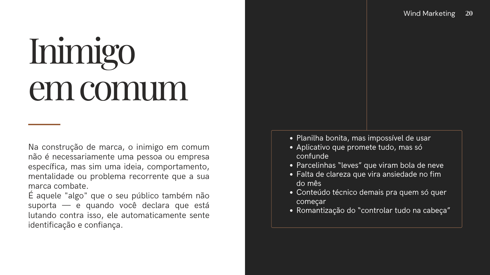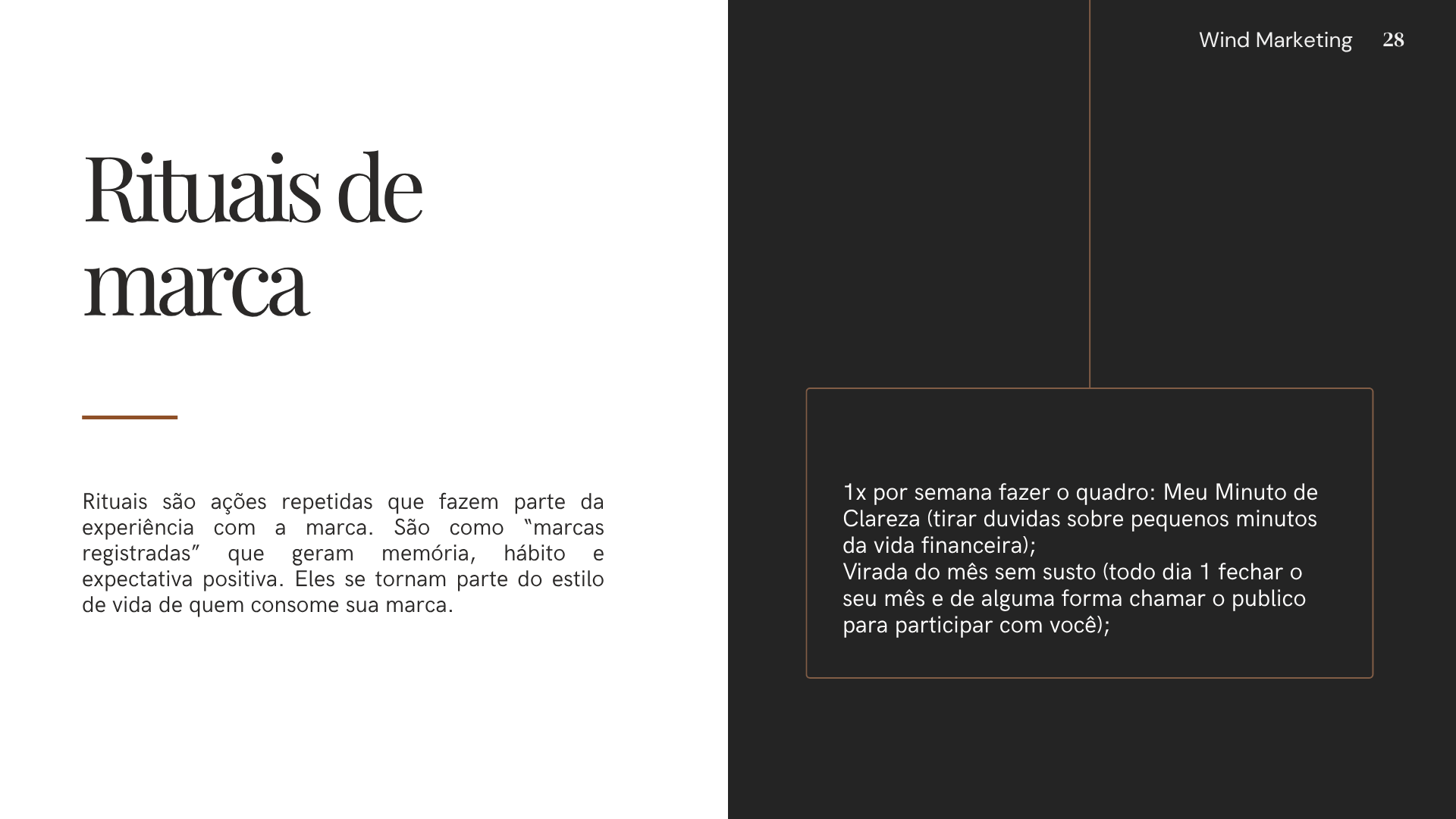 É um planejamento completo que organiza e traduz a essência da sua marca: tom de voz, posicionamento, persona, estética, cronograma de conteúdo, arquétipo e muito mais. É como um manual que guia todas as decisões da sua comunicação.