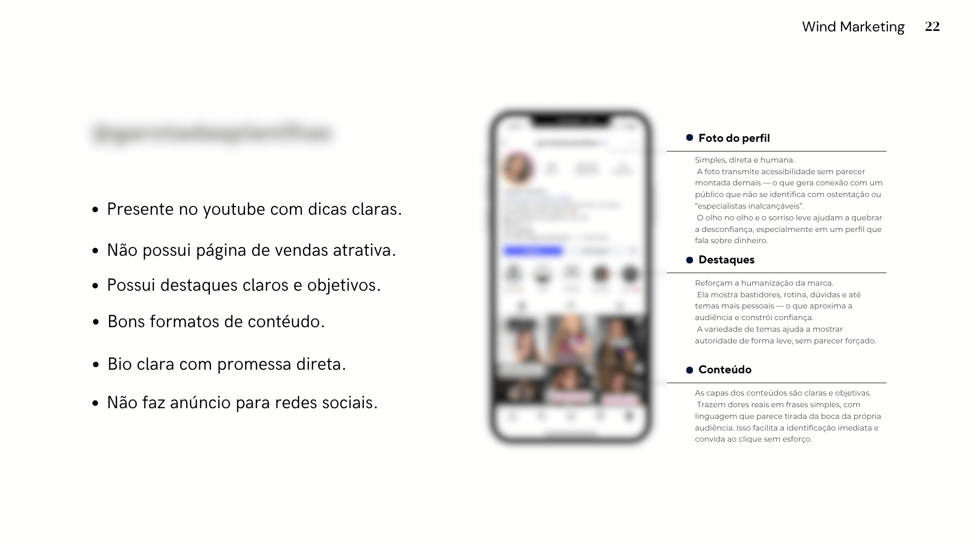 Você recebe não só o que comunicar, mas como. Desde o tom de voz até os rituais de conteúdo, passando por um cronograma mensal, reestruturação do perfil e temas-chave. Tudo para sua marca se tornar ainda melhor.